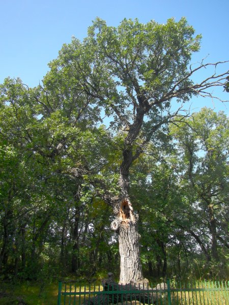 One of Manitoba's oldest trees is situated in Victoria Park in the town of Souris. It is a bur oak, and is reputed to be at least 500 years old by local dignitaries and residents. Its gnarled appearance and somewhat decadent condition attest to advanced age. An appropriate sign bearing the title "Old Oak Tree" has been erected in the park to indicate the specific location of the tree. This historic old oak tree is mentioned in the book, "The Souris Plains" by G.A. McMorran, 1956. Source: Manitoba Forestry Association. 1987. Heritage Trees of Manitoba. Canadian Forest Service. Winnipeg, Manitoba. P. 12. |